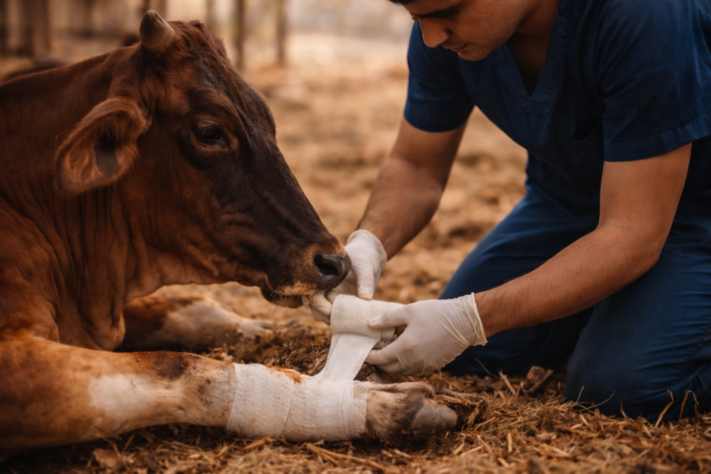 Regular treatment, emergency care, and recovery support for injured cows.